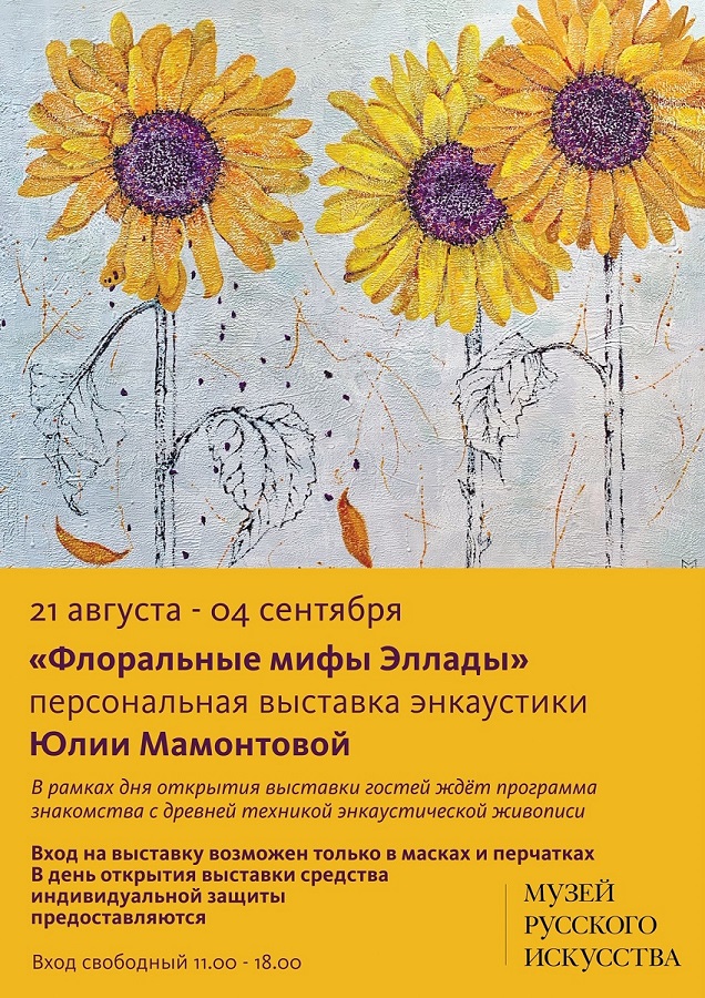 21 августа 2020 года в Москве в Музее Русского Искусства откроется выставка «Флоральные мифы Эллады». Выставка является персональной – на ней будут представлены работы московского художника Юлии Мамонтовой, выполненные в технике энкаустика.