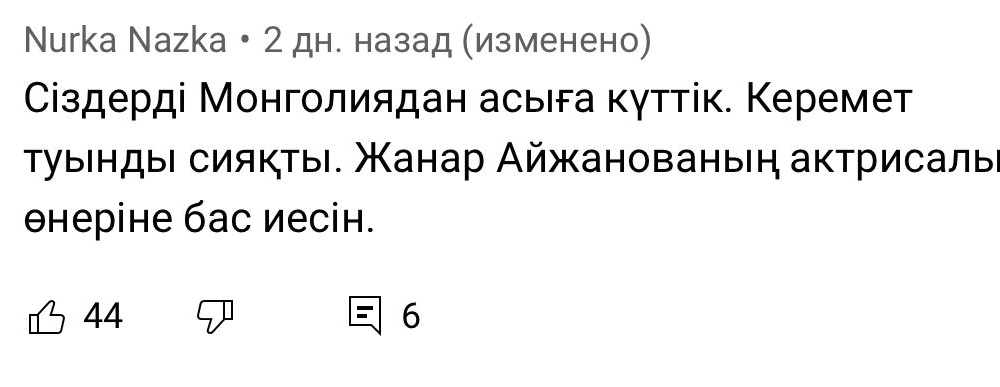 “Очень будем ждать вас в Монголии. Получилась великолепная история. Восхищаемся актерским искусством Жанар Айжановой”.