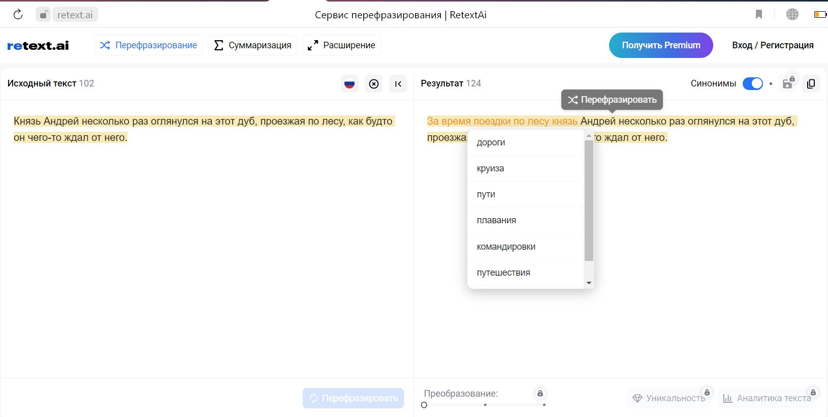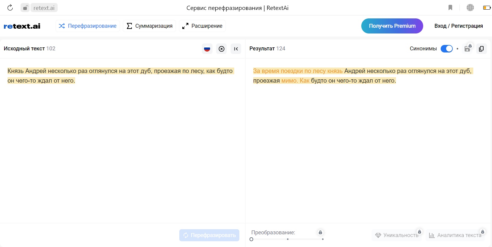 Также возможно преобразовать простой материал в экспертный или литературный за счет выбора лексически более сложных синонимов. Это может быть актуально для авторов, работающих по одной теме, но с разными целевыми аудиториями.