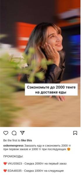 Публикации от блогеров носили, как чисто рекламный характер, где блогеры делились промокодами и предлагали сделать заказ со скидкой, так и личные рекомендации, в которых блогеры подсвечивали плюсы доставки и предлагали своим подписчикам убедиться в этом самим, использовав промокод на скидку.