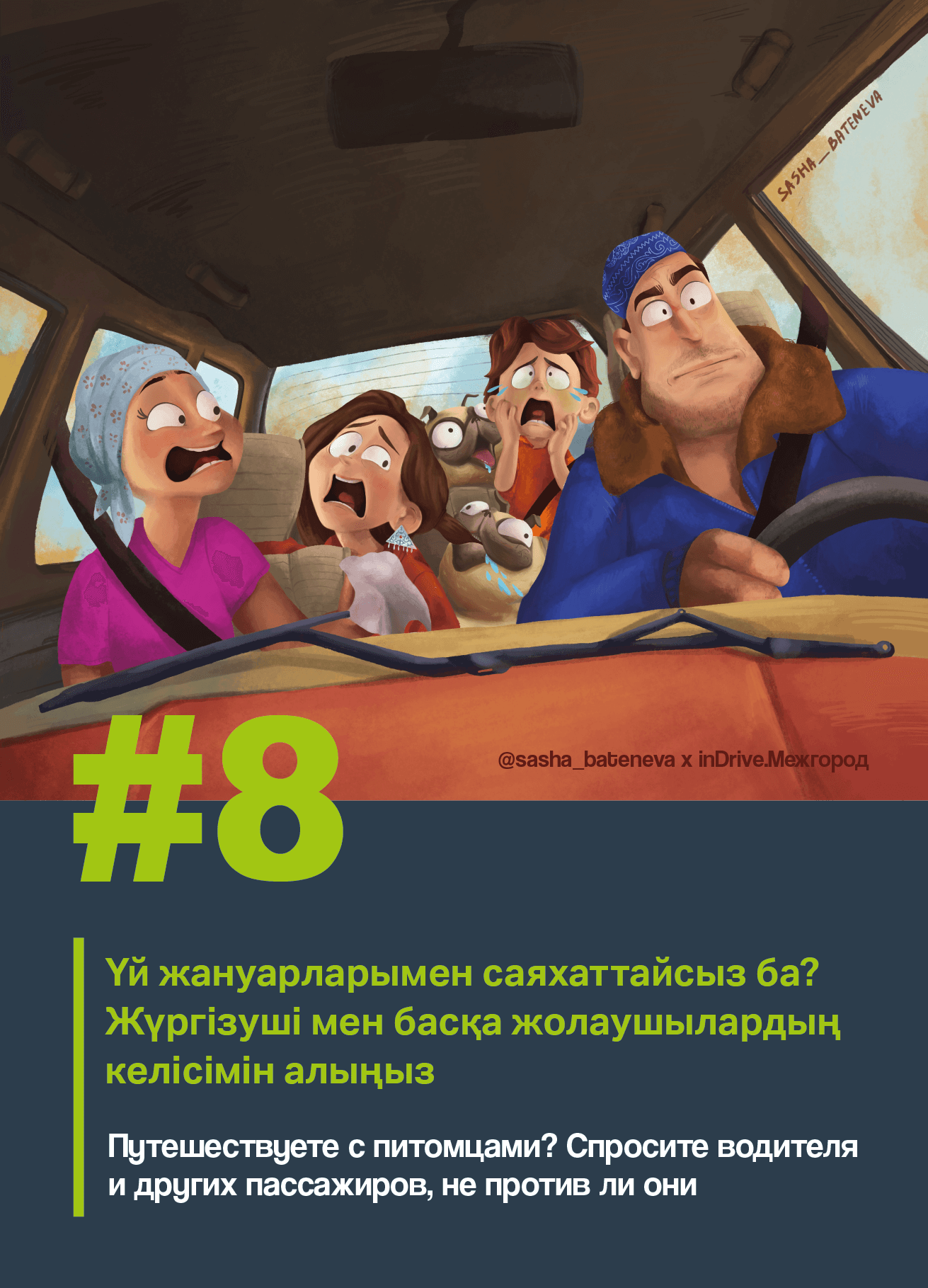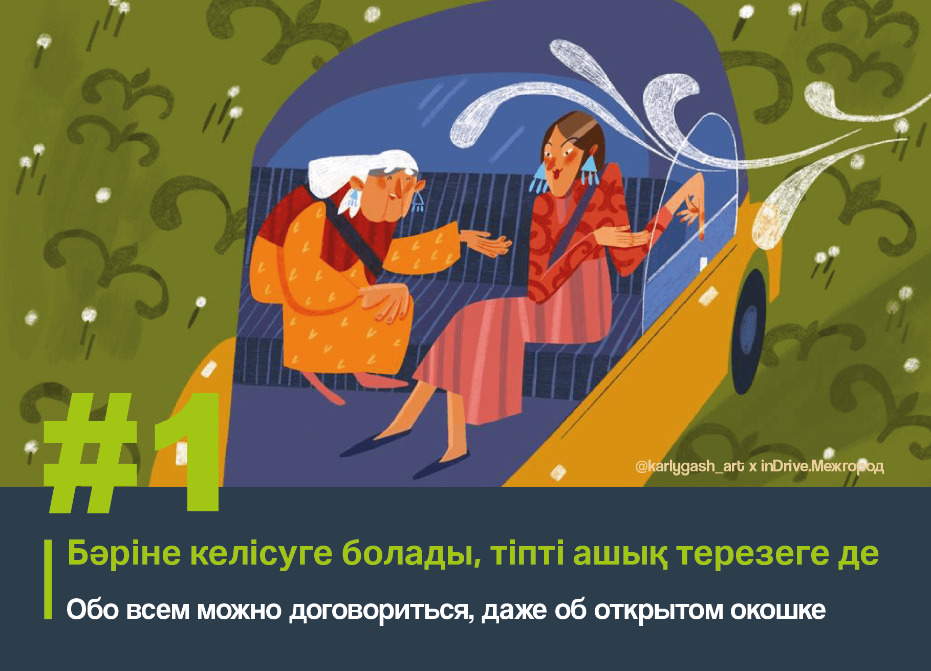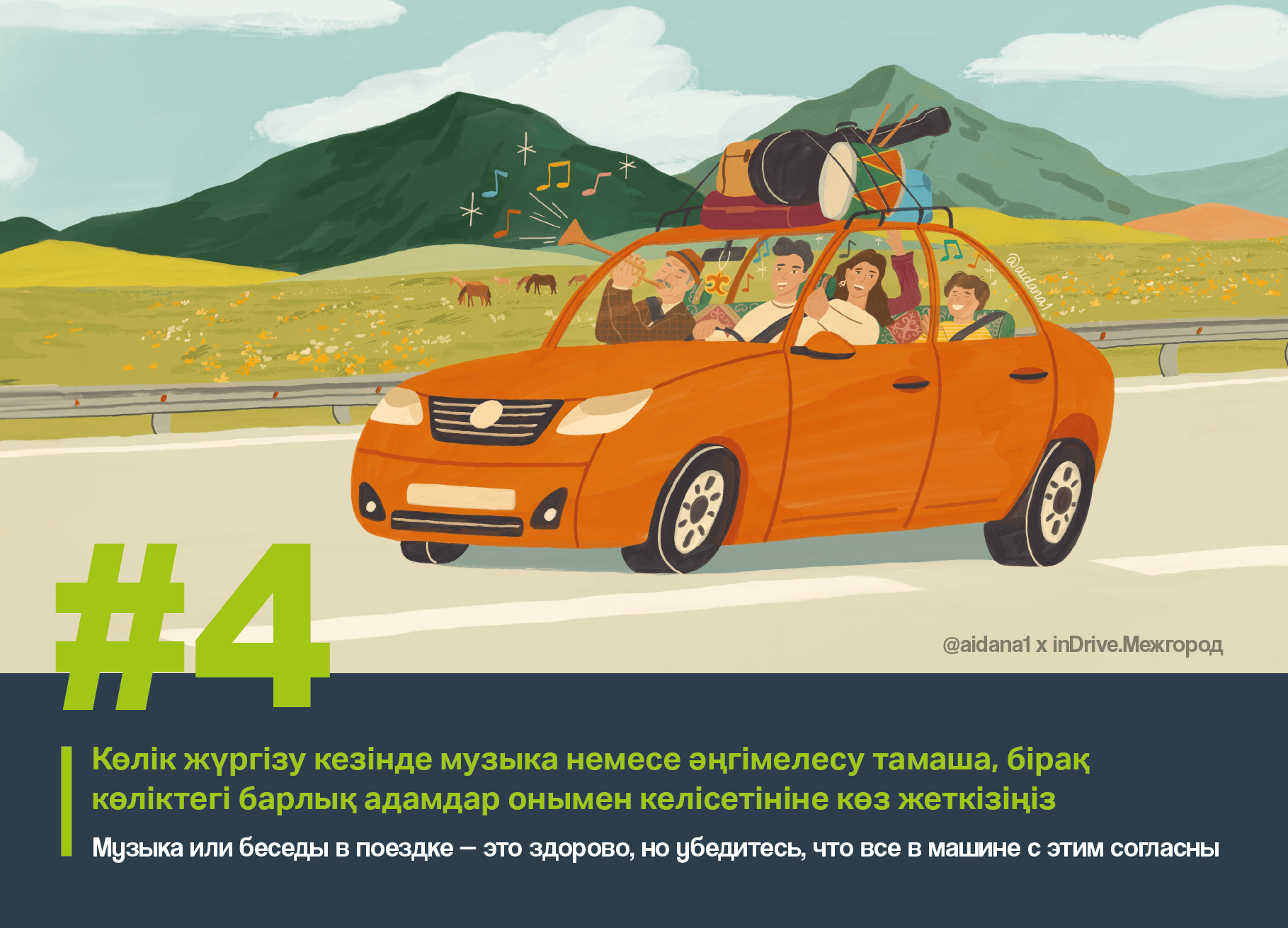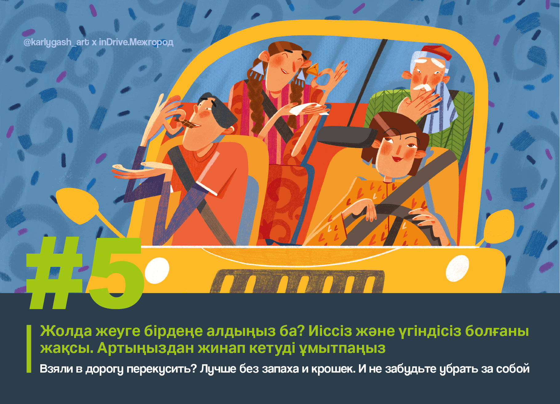 Однако совместные поездки могут приводить к самым неожиданным ситуациям, поэтому команда inDrive.Межгород вместе с талантливыми начинающими и уже известными художниками Казахстана решила рассказать о том, как путешествовать по Казахстану и вести себя во время дальних поездок на машине так, чтобы всем было удобно и комфортно: что уместно, а что нет в совместной поездке с незнакомыми людьми? А если едете долго? Можно ли смотреть TikTok со звуком? А есть сендвич? А отвлекать водителя? А как просить о незапланированной остановке? Ответы на эти и другие вопросы можно узнать в прекрасных арт-работах.