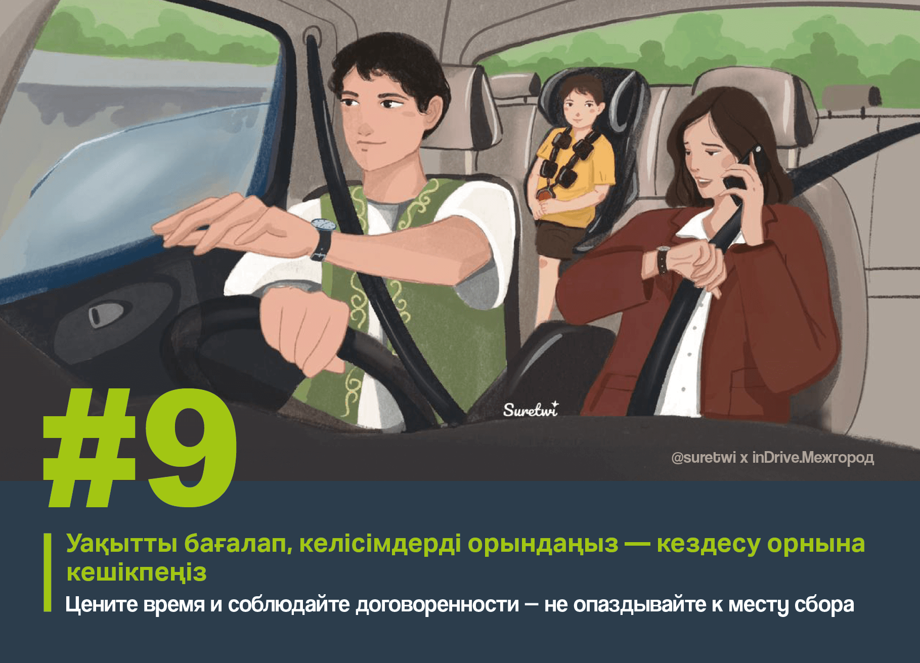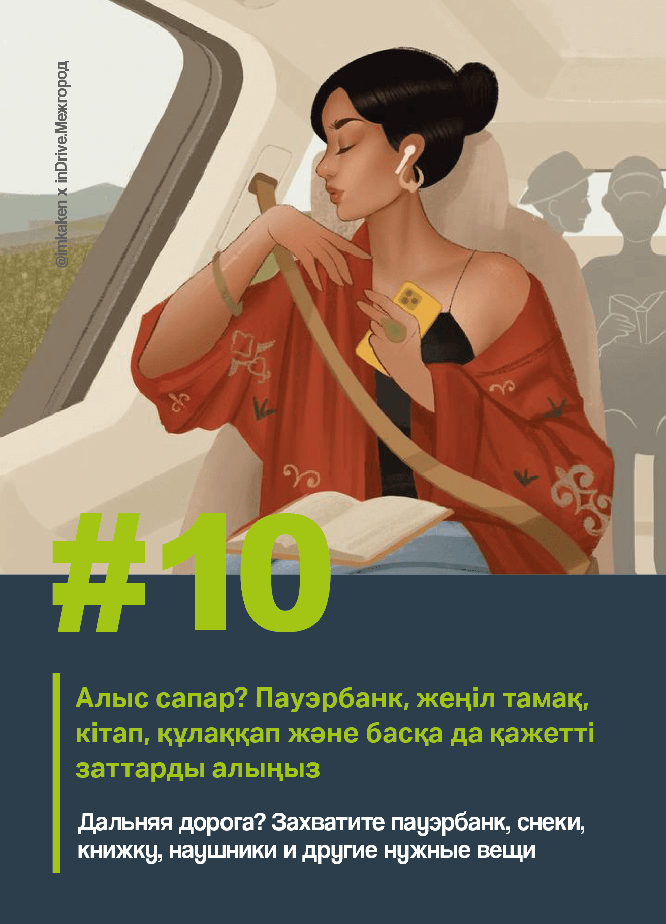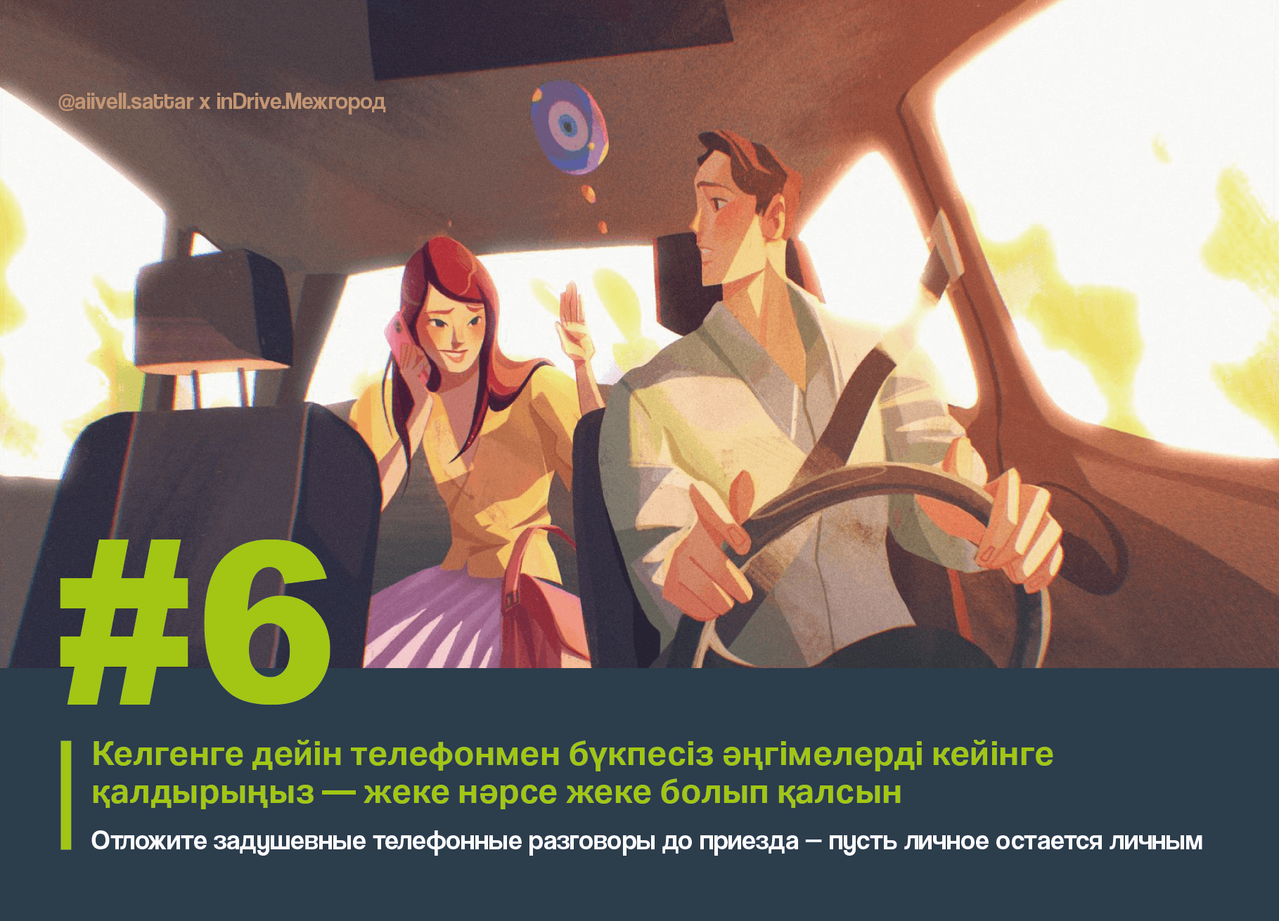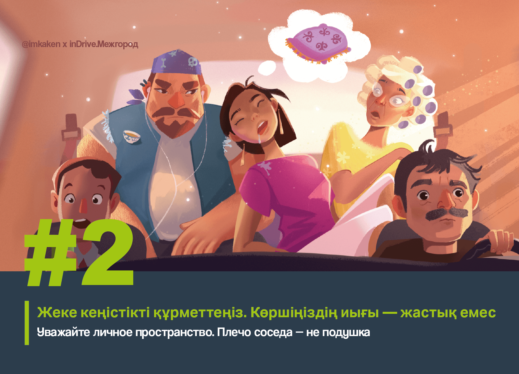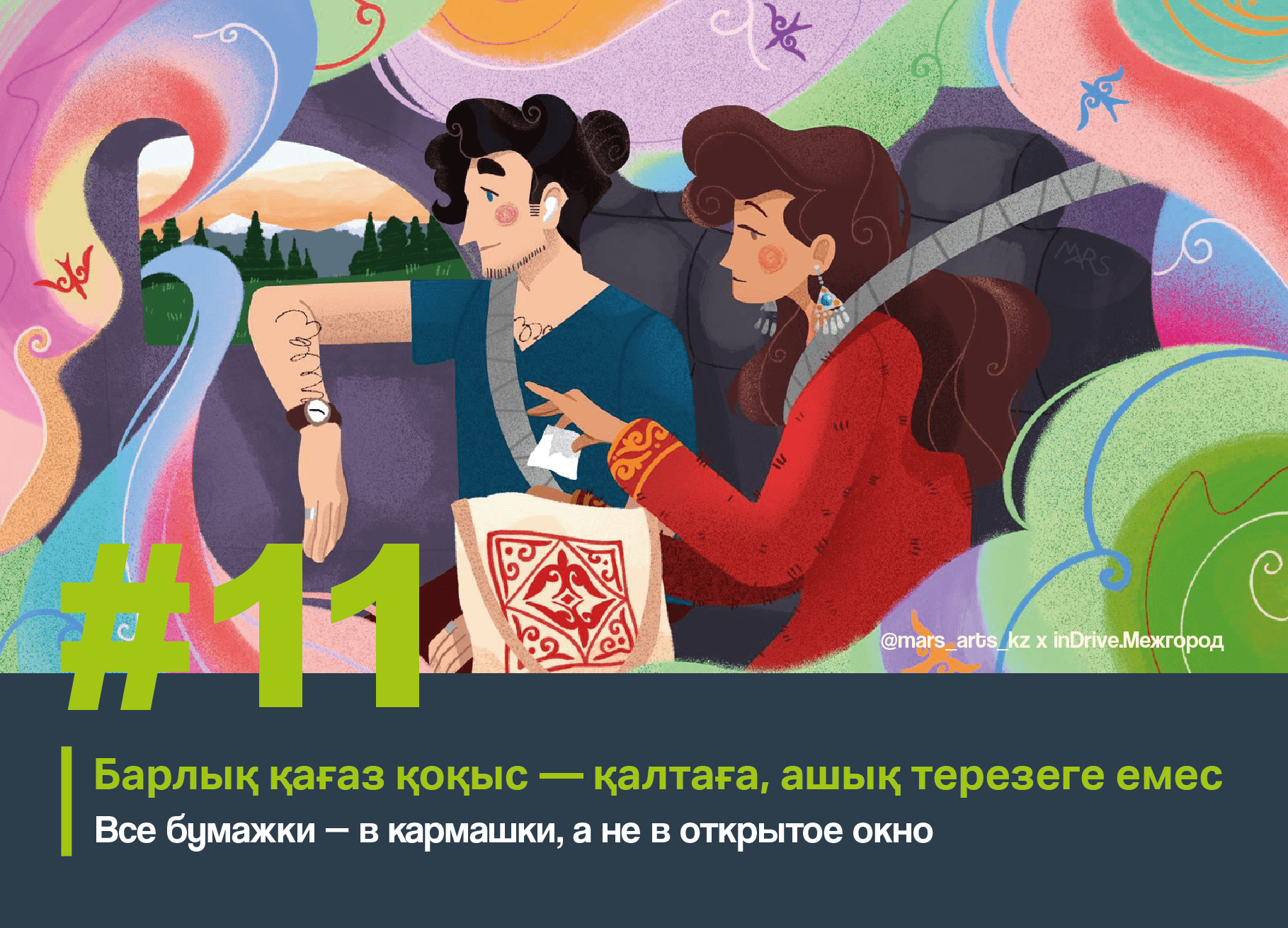 Однако совместные поездки могут приводить к самым неожиданным ситуациям, поэтому команда inDrive.Межгород вместе с талантливыми начинающими и уже известными художниками Казахстана решила рассказать о том, как путешествовать по Казахстану и вести себя во время дальних поездок на машине так, чтобы всем было удобно и комфортно: что уместно, а что нет в совместной поездке с незнакомыми людьми? А если едете долго? Можно ли смотреть TikTok со звуком? А есть сендвич? А отвлекать водителя? А как просить о незапланированной остановке? Ответы на эти и другие вопросы можно узнать в прекрасных арт-работах.