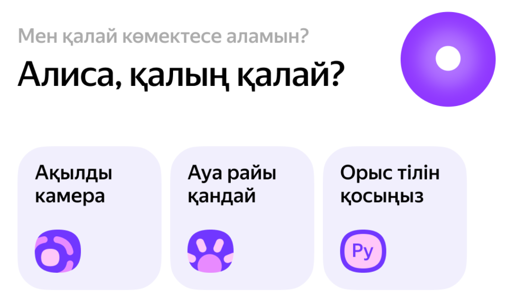 Всё это на казахском языке — голосовой ассистент Яндекса заговорил на нём с начала этой недели. Пообщаться с Алисой на родном языке могут и сами казахстанцы. Для этого нужно скачать или обновить приложение Яндекса или мобильный Яндекс Браузер, нажать на фиолетовую иконку Алисы и воспользоваться кнопкой «Изменить язык».