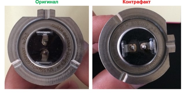 Контакты нити накала у контрафакта по сравнению с оригинальными более плоские и крупные.