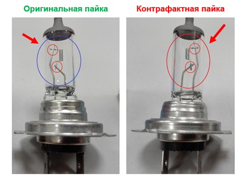 2. Сравнить внешний вид колбы лампы, а именно контакты нити накала. У контрафакта они значительно крупнее и имеют грубые формы.