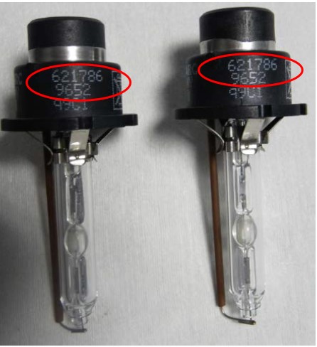 Так как маркировка наносится с помощью лазера, то она легко читается, имеет четкий шрифт и не стирается пальцами. Маркировка контрафактных ламп серого цвета и плохо различима и, в отличие от оригинальной, ее легко стереть пальцем. Пример на фото ниже: