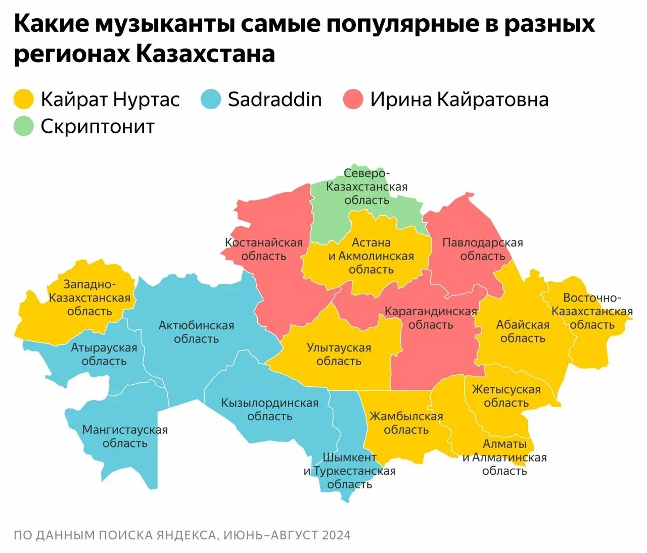 Аналитики Яндекса обнаружили, что в разных регионах Казахстана отличаются самые популярные исполнители. Например, пользователи из Алматы, восточных и юго-восточных областей страны, а также из Западно-Казахстанской и Акмолинской области чаще всего спрашивают в Поиске про Кайрата Нуртаса. На западе, юго-западе и на юге больше популярен Sadraddin, а в центральной части и на севере — Ирина Кайратовна и Скриптонит.
