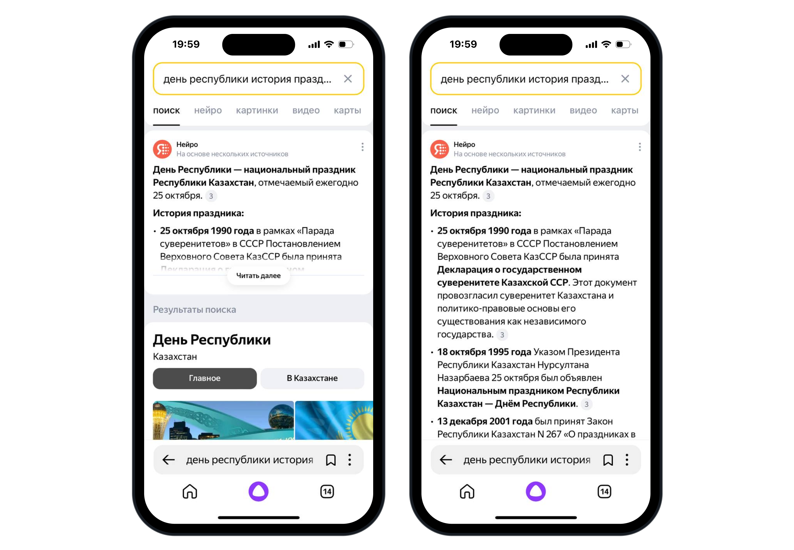 Ко Дню Республики Поиск с Нейро ответил на популярные вопросы казахстанских пользователей про национальный праздник. Например, в чём значимость Дня Республики, какова история его возникновения и в какие дни казахстанцы будут отдыхать. Кроме того, на главной странице Яндекс Поиска появилось специальное изображение к празднику – Алтын Адам, один из символов Республики Казахстан. При нажатии на него появляется информация про День Республики и запускается салют.