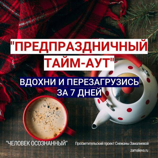 Новый год — символ нового начала. Самое время завершить незаконченные дела, правильно расставить приоритеты и создать праздник, который вдохновит вас на новые достижения. Однако нередко предпраздничная суета может оказывать давление, заставлять переживать неприятные последствия от повышения стандартов и создавать излишний стресс. Чтобы вы могли вступить в новый год с новыми силами и запасом энергии, Снежана Замалиева, признанный эксперт в области осознанности и ментального благополучия, объявила о запуске бесплатного 5-дневного мини-марафона «Предпраздничный тайм-аут: вдохни и перезагрузись».