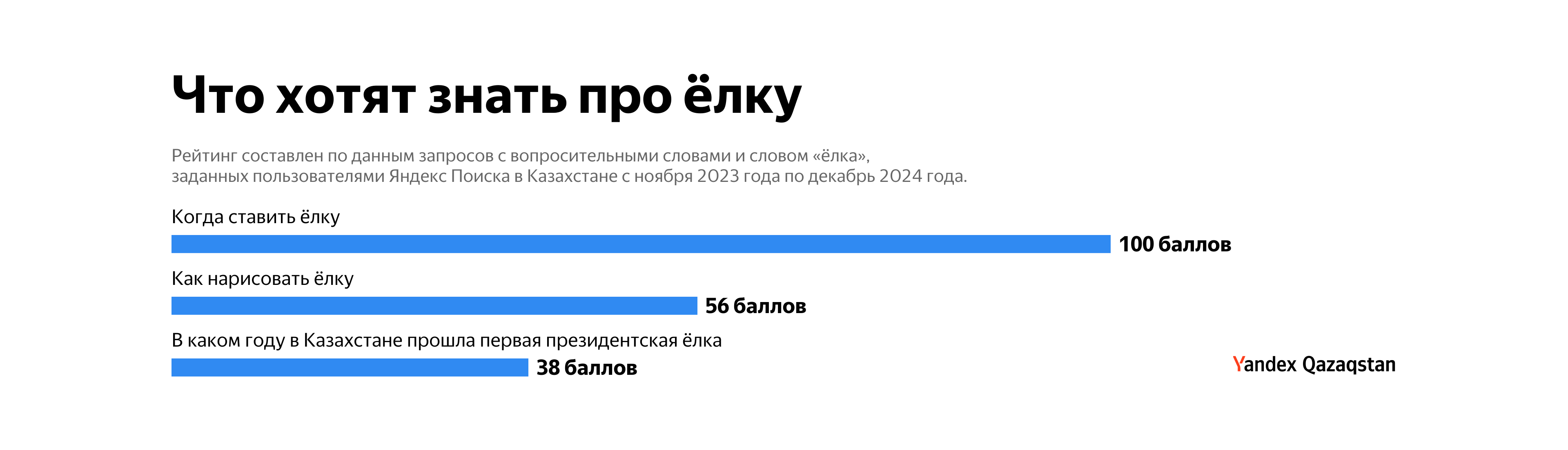 Казахстанские пользователи интересуются и главным символом Нового года — ёлкой. Три самых популярных вопроса про неё — когда ставить ёлку, как её нарисовать, в каком году в стране прошла первая президентская ёлка.