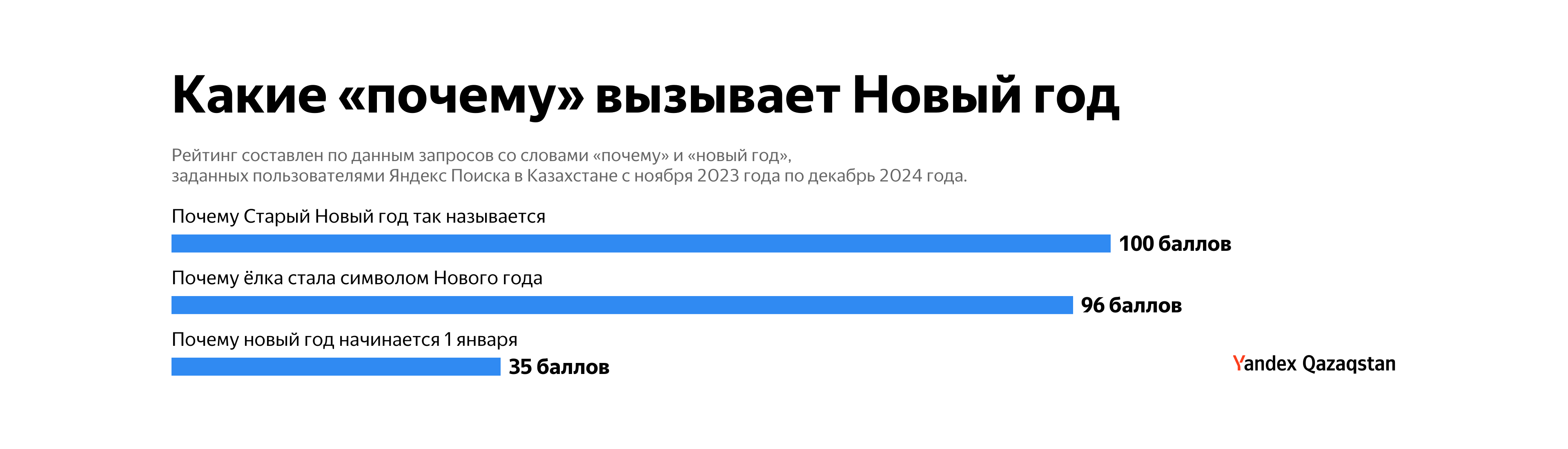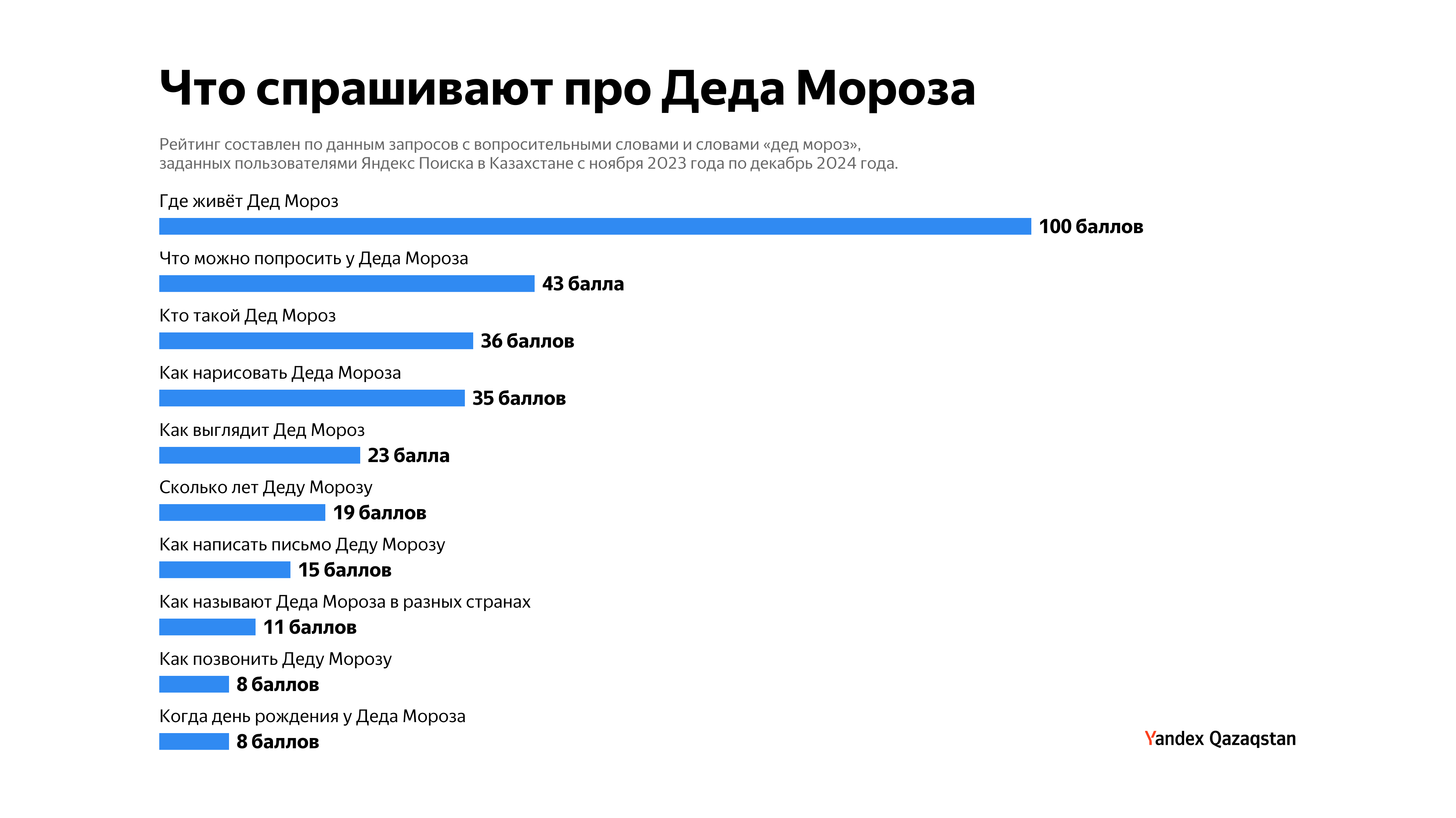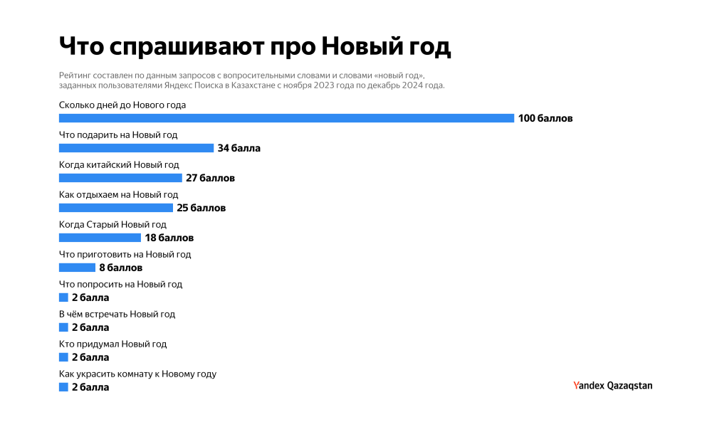 В преддверии Нового года Yandex Qazaqstan изучил поисковые запросы казахстанских пользователей и выяснил, что они чаще всего спрашивают про наступающий год Змеи и Деда Мороза, рецепты каких новогодних салатов ищут и кому готовят подарки на праздник. Аналитики компании оценивали популярность запросов в Поиске Яндекса по стобалльной шкале: чем больше частота запроса, тем выше балл.