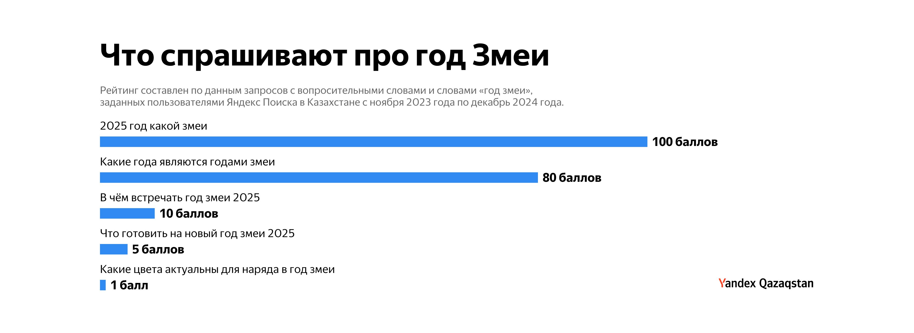 Самые популярные вопросы казахстанских пользователей в Поиске Яндекса — какая именно змея является символом наступающего года и какие ещё годы называются годами Змеи. Пользователи также интересуются подготовкой к празднованию наступающего года Змеи — спрашивают, что надеть и какие угощения приготовить к празднику. В топ-5 вошёл и другой вопрос про гардероб — какие цвета одежды будут актуальны в год Змеи.