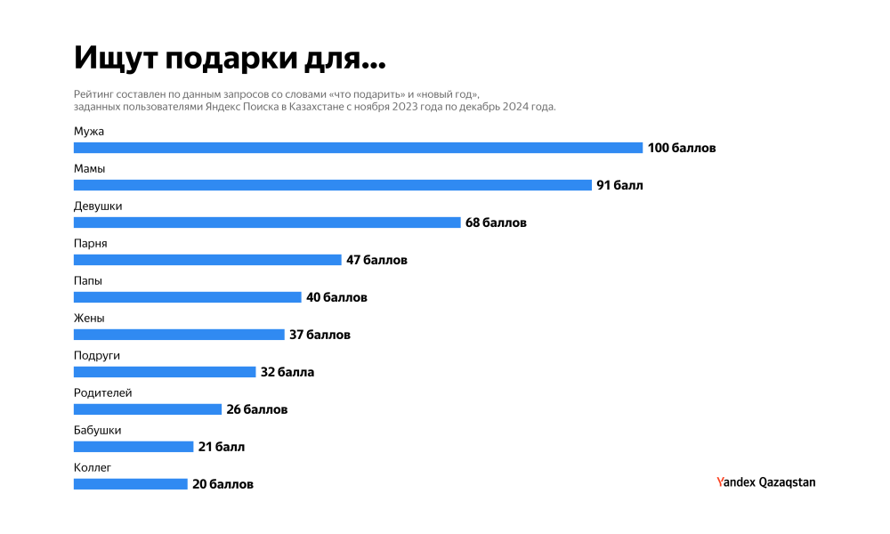 Казахстанские пользователи спрашивают в Поиске Яндекса и про то, кому что лучше подарить на Новый год. Самые популярные варианты — какой презент выбрать для мужа, мамы, девушки, парня, папы. В топ-10 вошли также вопросы про то, что подарить жене, подруге, родителям, бабушке, коллегам.