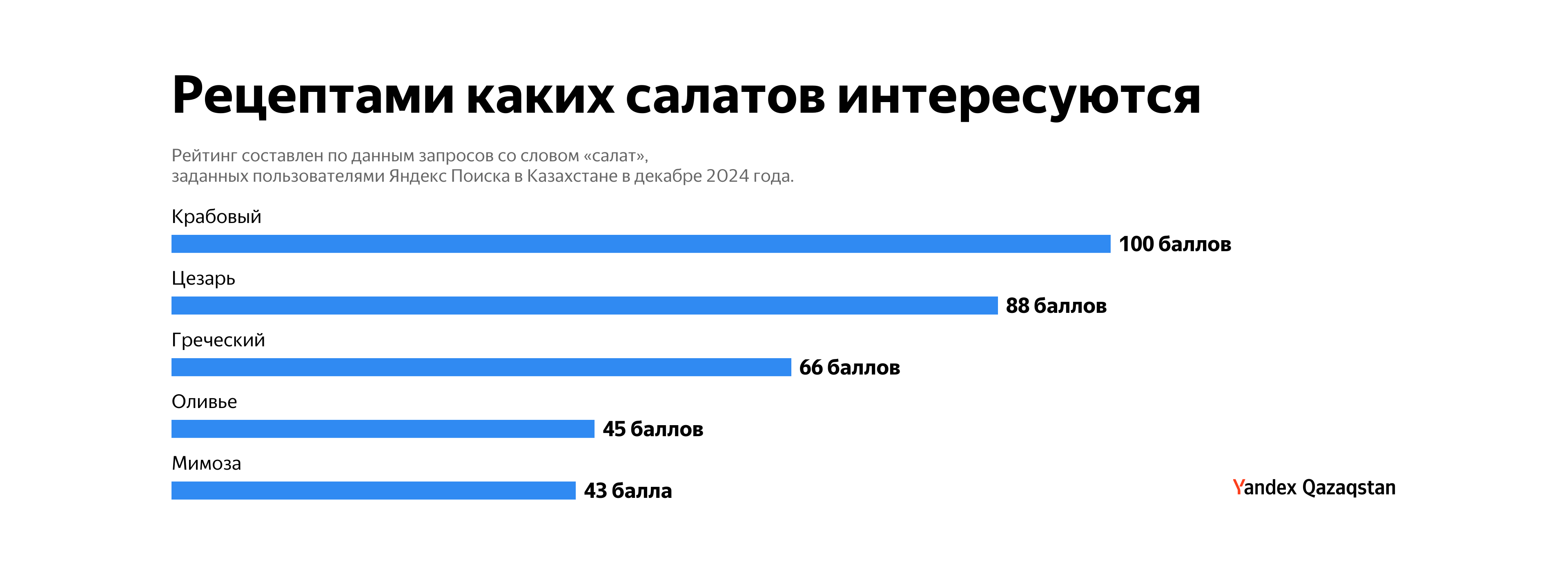 В преддверии Нового года казахстанские пользователи спрашивают, как приготовить тот или иной салат. Три самых популярных варианта — крабовый, цезарь и греческий. На четвёртом месте оказался оливье, а на пятом — мимоза.